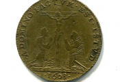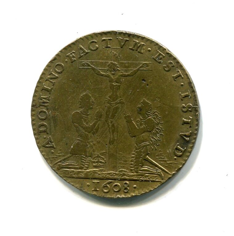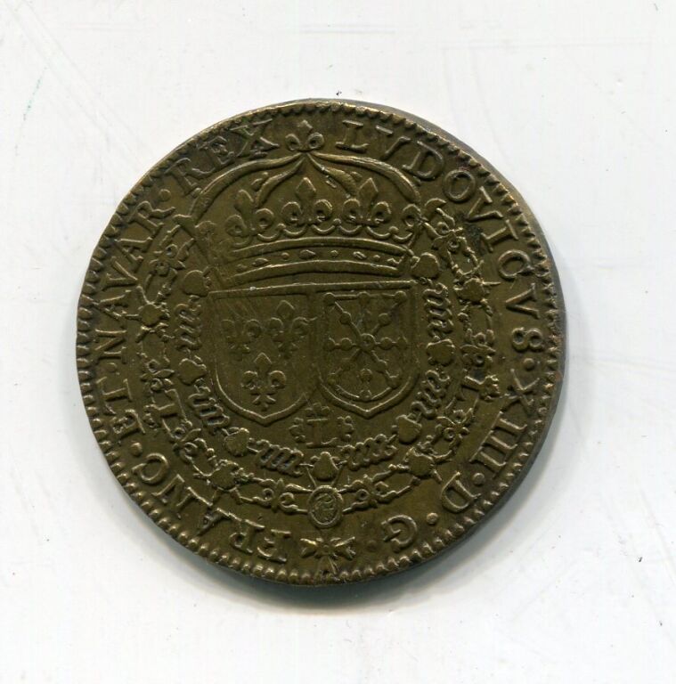 MAISON COMMUNE de la VILLE D'ORLEANS - laiton - 1608 - " (fleur de lis) LVDOVICUS . XIII .D. G. FRANC. ET. NAVAR. REX, écus de France et de Navarre couronnés entre deux colliers - Revers : A. DOMINO. FACTVM. EST. ISTVD., à genoux au pied d'un crucifix le roi à gauche sa couronne à ses pieds et Jeanne d'Arc à droite. A l'exergue DATE 1608. - frappe monnaie - L/A n° 1384 - 27 mm - 5,82 grammes - TTB
