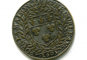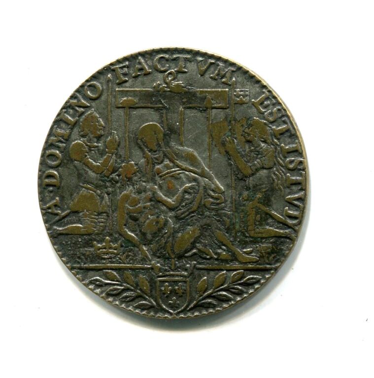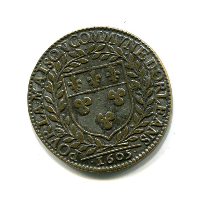 MAISON COMMUNE de la VILLE D'ORLEANS - laiton argenté - " 1605 - " POVR. LA. MAISON. COMMVNE. DORLEANS " - en centre armes d'Orléans entourées de deux palmes - Revers : A. DOMINO. FACTVM. EST. ISTVD., Piéta en centre sur fond de croix et entourée, à gauche, du roi cuirassé à genoux, son casque à ses pied, et à droite de Jeanne d'Arc cuirassée et à genoux, tenant la bannière de France. A l'exergue l'écu de France couronné. - frappe monnaie -