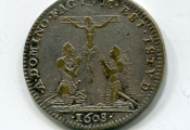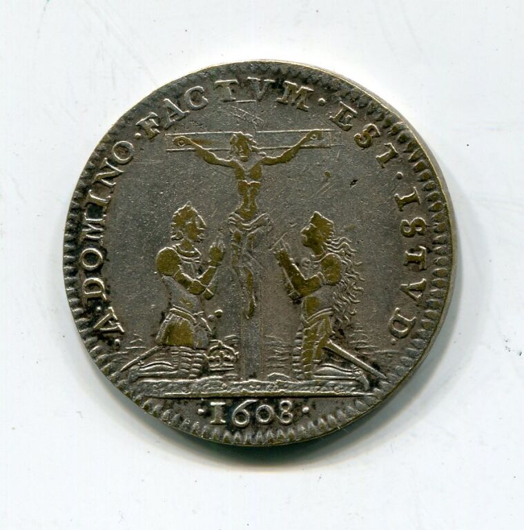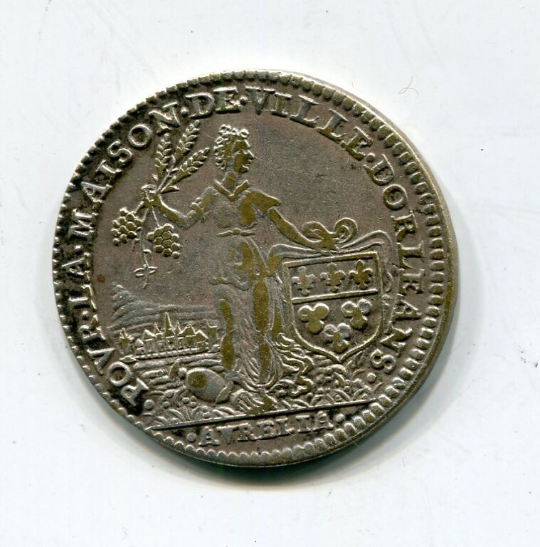 MAISON COMMUNE de la VILLE D'ORLEANS - RARE laiton argenté - 1608 - " POVR. LA. MAISON. DE. VILLE. DORLEANS " - en centre Femme debout appuyée sur le blason de ville et brandissant une poignée d'épis et de raisins ; à ses pieds une urne renversée. Au loin vue sur la ville. ; à l'exergue AVRELLIA - Revers : A. DOMINO. FACTVM. EST. ISTVD., à genoux au pied d'un crucifix le roi à gauche sa couronne à ses pieds et Jeanne d'Arc à droite. A l'exergue DATE 1608. - frappe monnaie -