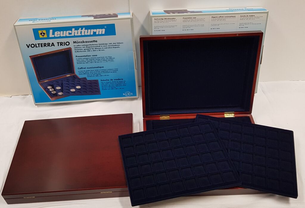 MATERIEL - Coffrets pour MONNAIES marque LEUCHTTURM VOLTERA TRIO pour, chacun, 144 pièces au format maxi de 30 mm. Luxueux coffrets bois 34 x 26,5 x 4,8 cm, fermoir par aimant, contenant chacun 3 plateaux velours bleu -