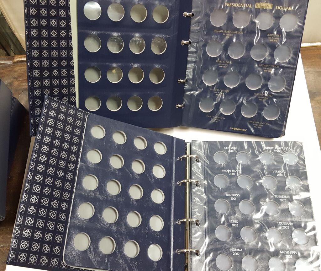 > l'album des Dollars Présidentiels. Émission de 43 pièces différentes entre 2007 et 2016. Créées par le Ministère des finances des USA chacune de ces pièces de 1 Dollar représente un président du pays (4 pièces émises chaque année). Prestigieuse série au portrait des 43 présidents américains élus de 1789 (Georges Washington à Georges W. Busch (2001). L'album se compose de 6 feuilles à cases légendées. 5 cases sont vierges pour les futurs présidents. Reliure aux armes des USA avec son boitier
