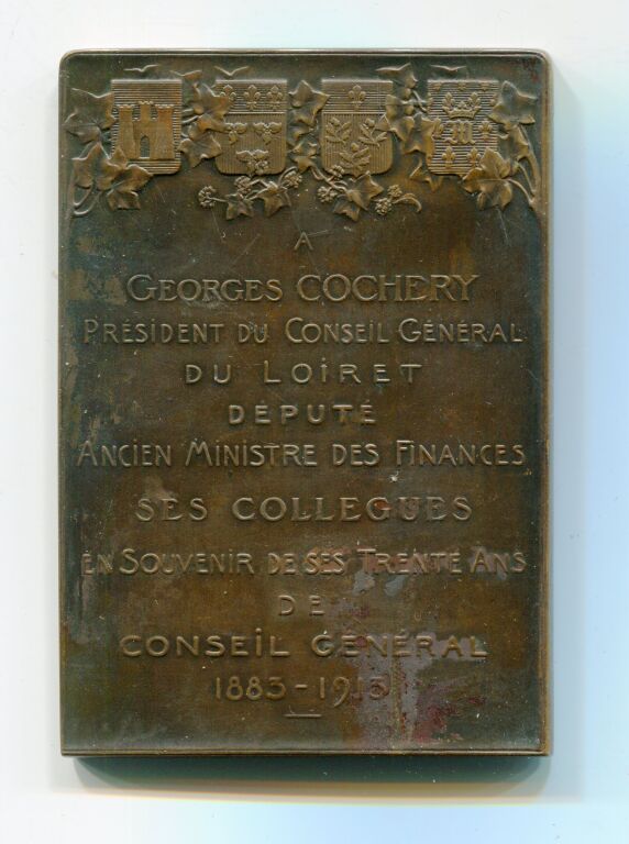 Texta au revers : "à Georges COCHERY, Président du Conseil Général du Loiret, député, ancien ministre des finances. Ses collègues en souvenir de SES TRENTE ANS de Conseil Général 1883 - 1913, blasons des 4 grandes villes du Loiret. - L/A n° 2436 - TTB