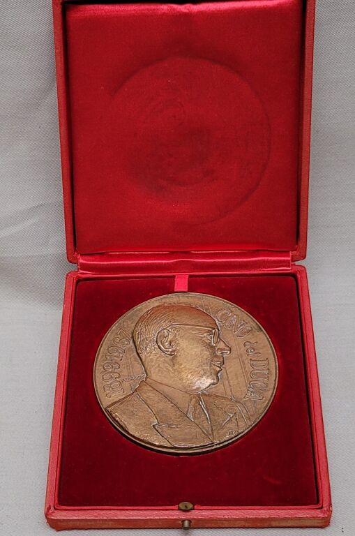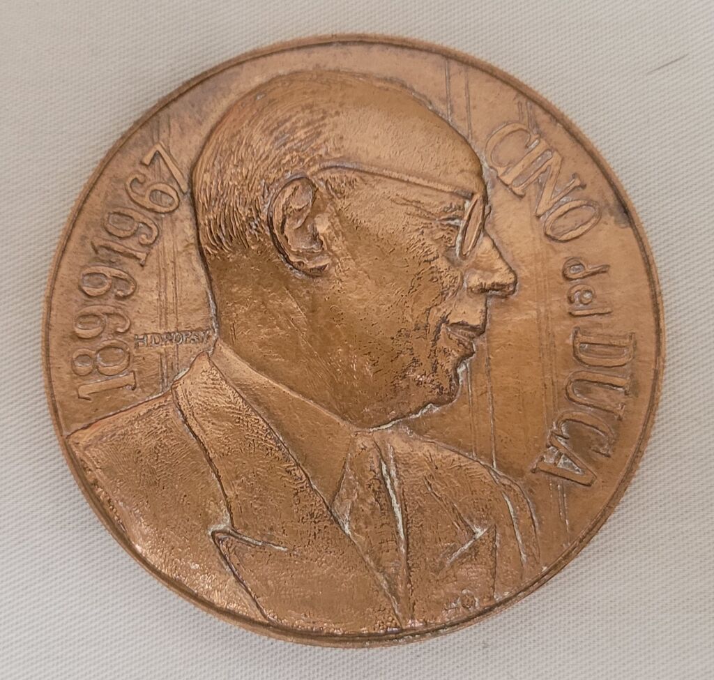 MEDAILLE de table grand module en MÉMOIRE de CINO DEL DUCCA (* ).son buste profil à droite par DROPSY ( ** ) mentions 1899 - 1967 Cino Del Duca - Revers : ses plus gros titres de journaux : " Paris jour, Historia, Intimité, Nous Deux, Mode de Paris, Stop, Télé poche " ; en centre livre ouvert où il est écrit : " Homme de presse et éditeur, célèbre ami des humbles et des Grands, ni l'âge ni la fortune ne devaient changer le cœur généreux de l'enfant pauvre qu'il avait été ".