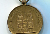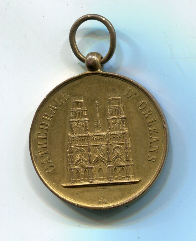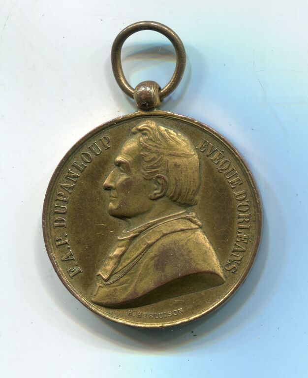 Médaille d'honneur " F.A.P. DUPANLOUP / EVEQUE D'ORLEANS " ( * ), son buste en habits ecclésiastiques, profil à gauche - Revers : "CATHEDRALE D'ORLEANS" la cathédrale de face, gravure de Dantzell - Herluison édition. - cuivre doré -