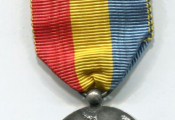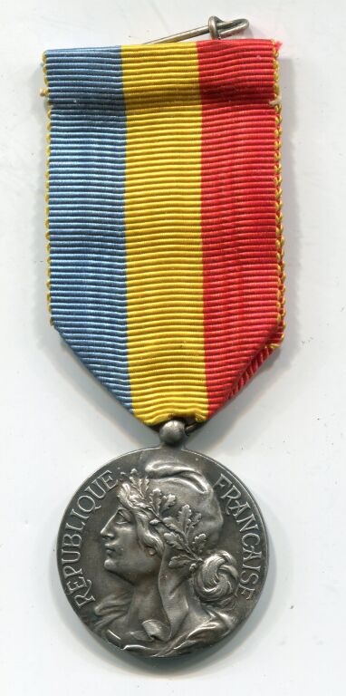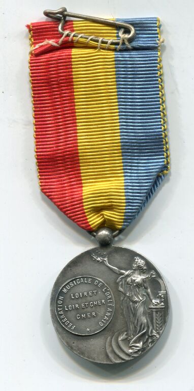 MEDAILLE PENDENTE - "FEDERATION MUSICALE DE L' ORLEANAIS / LOIRET / LOIR & CHER / CHER " - module argenté 27 mm avec bélière avec ruban tricolore bleu-jaune-rouge. "République Française ", tête laurée à gauche coiffée du bonnet phrygien.