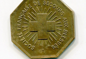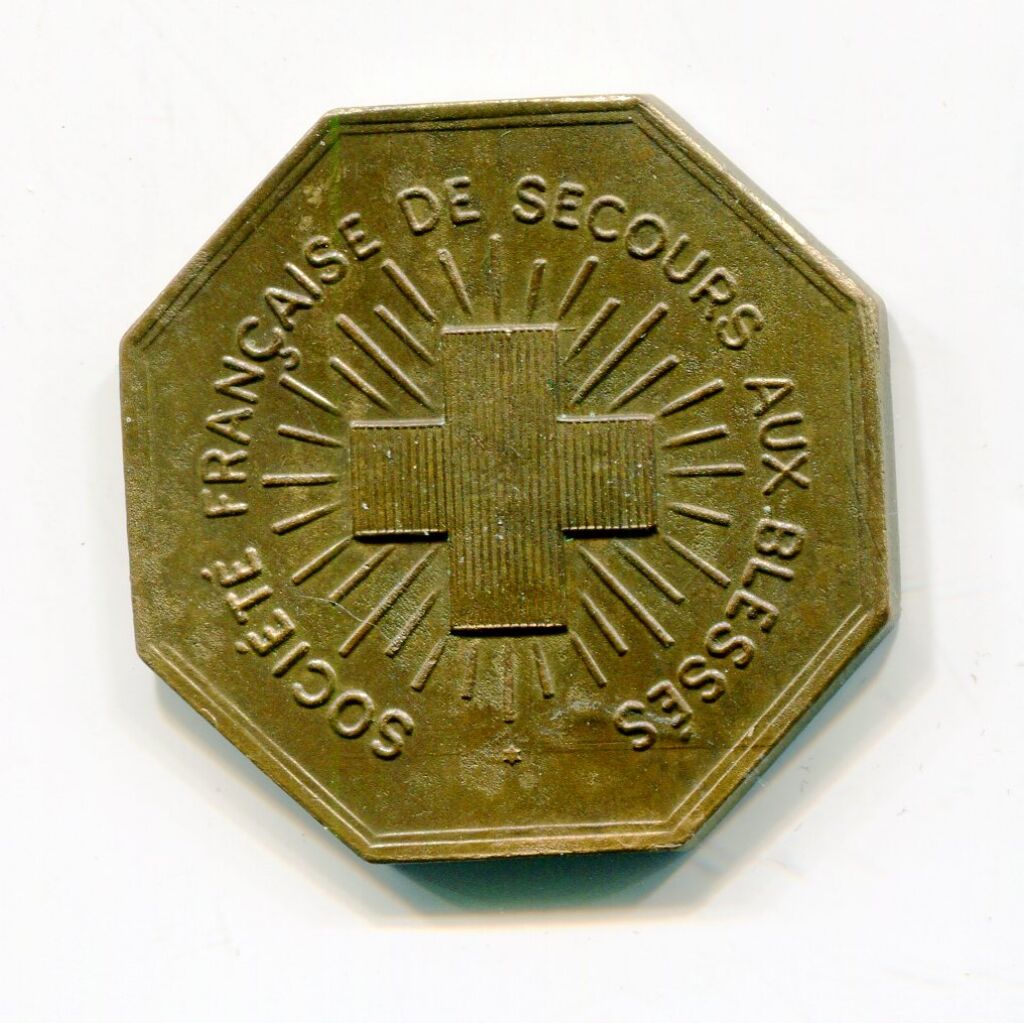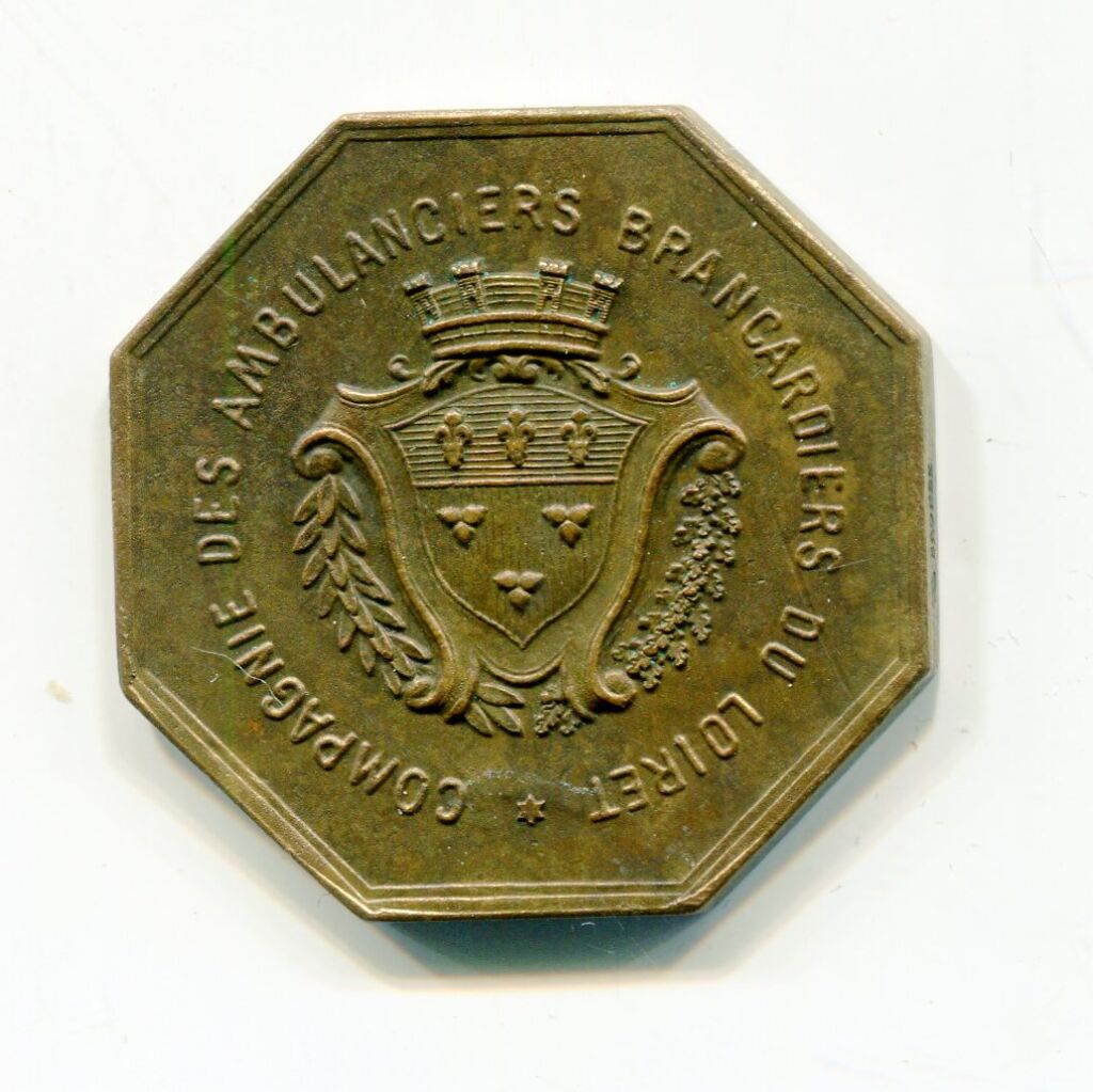 MEDECINE - CROIX ROUGE " COMPAGNIE des AMBULANCIERS BRANCARDIERS du LOIRET " en légende circulaire - en centre blason d'Orléans surmonté d'une couronne à 4 tours entouré de rameaux de chêne & laurier - Revers : SOCIETE FRANCAISE de SECOURS aux BLESSES - Croix (rouge) rayonnante en centre. - TTB