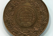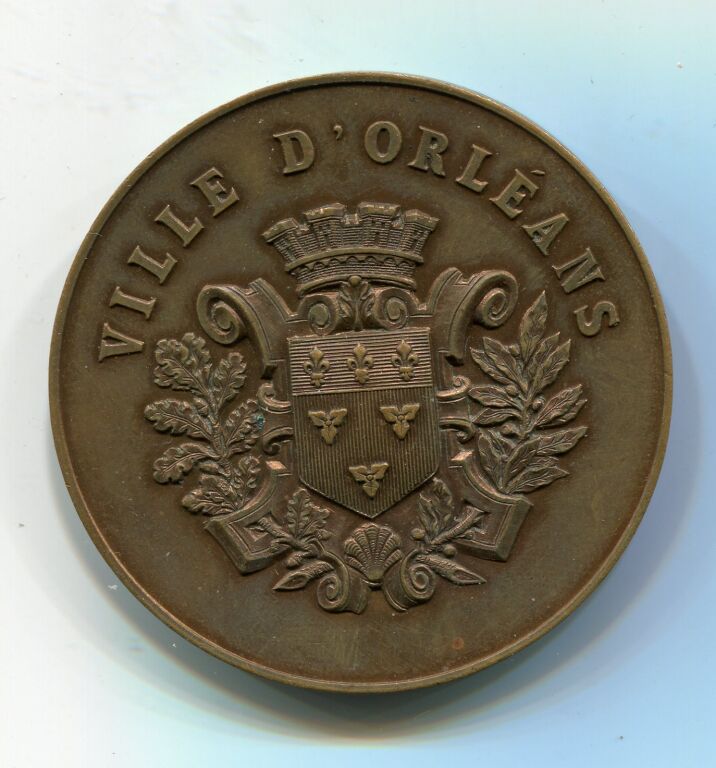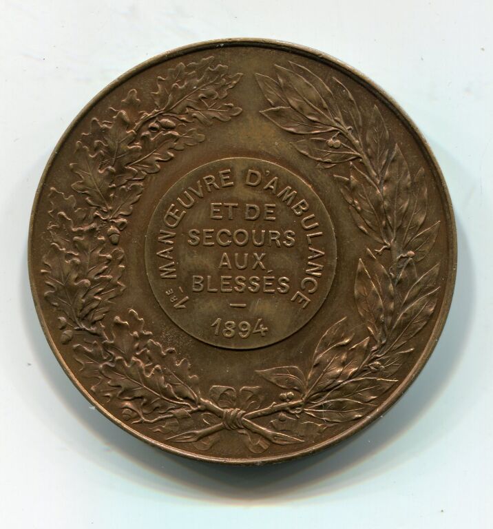 MEDECINE " VILLE D' ORLEANS " - blason de ville haut relief en centre surmonté d'une couronne à 4 tours, entouré de rameaux de chêne et laurier. Revers : en centre, " 1ère MANOEUVRE D'AMBULANCE et de SECOURS AUX BLESSES 1894 " dans une couronne de feuilles de chêne et d'olivier. - Bronze 50 mm, poinçon corne. -
