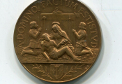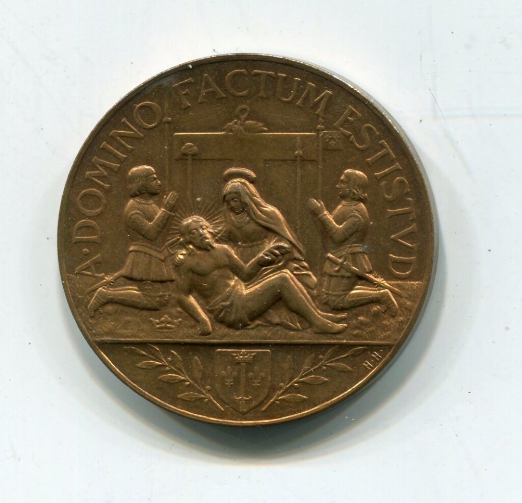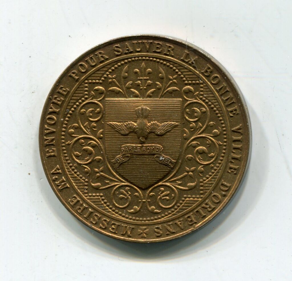 " MESSIRE M'A ENVOYEE POUR SAUVER LA BONNE VILE D'ORLEANS ", Médaille bronze, quadrilobe avec en centre blason avec colombe tête en bas tenant une banderole inscrite " de par le roi du ciel " - Revers : A . DOMINO FACTUM ESTISTVD, Piéta tenant une croix cantonnée de 2 soldats en prière. A l'exergue blason de JEANNE D'ARC entre 2 rameaux d'olivier - 32 mm - 15 grammes - L/A n° 963 - FDC avec velours de frappe