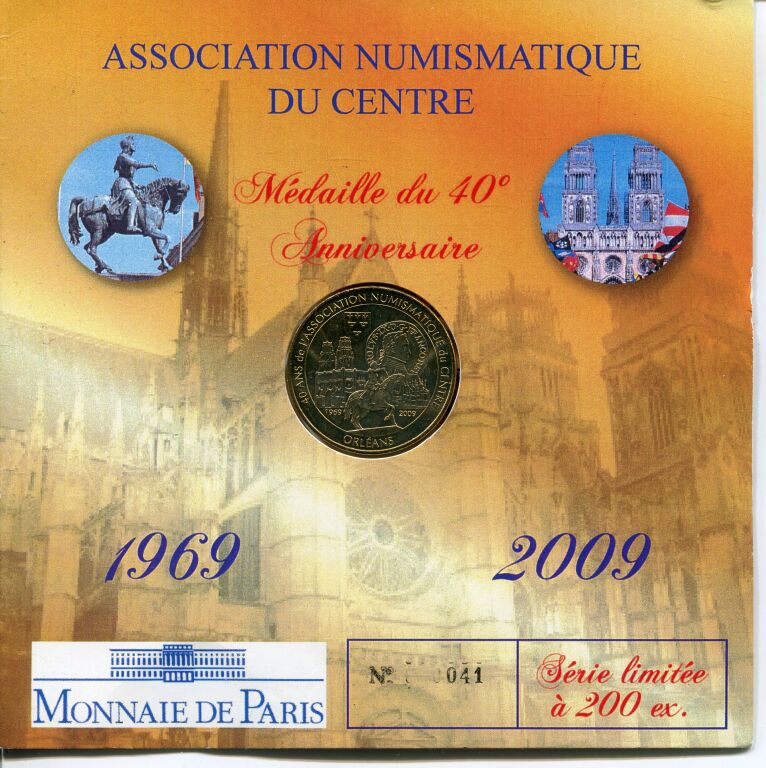 MONNAIE de PARIS - MEDAILLE TOURISTIQUE MONNAIE de PARIS "40e anniversaire de l'association numismatique du centre 1969 / 2009 " - sur blister spécial, série numérotée limité à 200 exemplaires, blister ouvrant avec historique de ville et historique du teston Charles X frappée lors de la révolte des Huguenots en 1562 et 1563 avec le métal récupéré après pillage du monastère de Fleury.