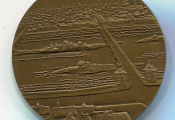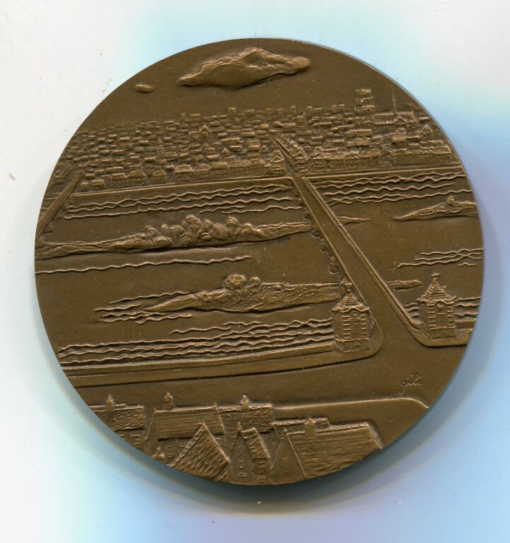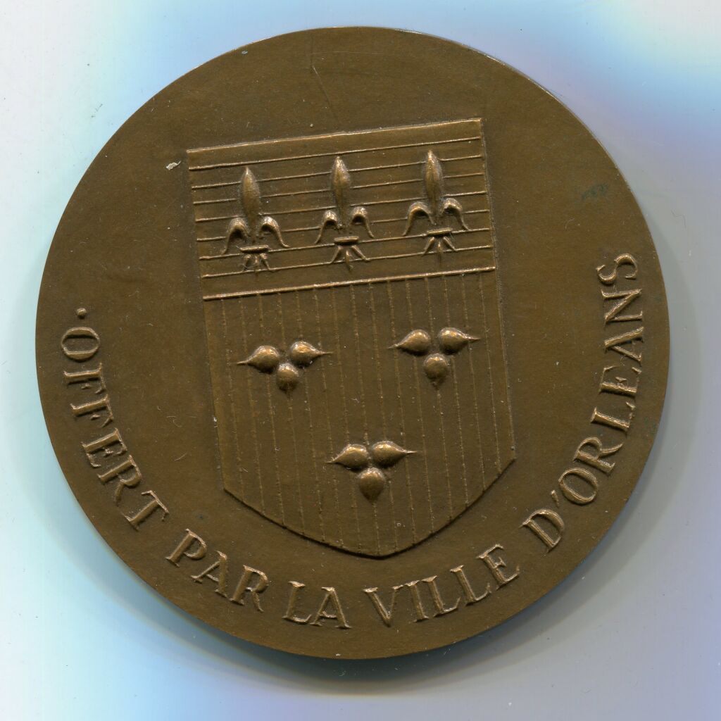 " OFFERT PAR LA VILLE D'ORLEANS " - spectaculaire médaille BRONZE - frappe 1973 - 68 mm - 134 grammes. - Blason de ville et légende - Revers : perspective de la ville, vue panoramique, la Loire au premier plan - Gravure signée Gilli - poinçon corne.