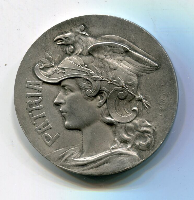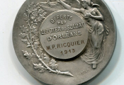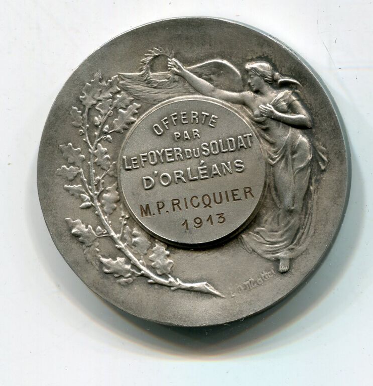" OFFERT PAR LE FOYER du SOLDAT D'ORLEANS " - médaille 41 mm : " PATRIA ", la Patrie profil à gauche coiffée du casque corinthien ailé surmonté d'un coq ailes déployées. Revers : texte et attribution à M.P. RICQUIER 1913 - œuvre signée L. O. MATTEI.