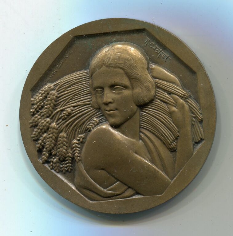 " OFFICE AGRICOLE DEPARTEMENTAL du LOIRET " - Très belle médaille bronze art déco de Robert COCHET, dans un octogone une jeune femme de face, porte une gerbe de blé sur l'épaule - Revers : six rayons en cercle sur palmes, titre en centre.