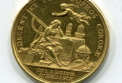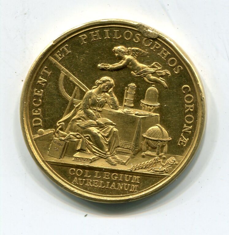 Revers : " DECENT ET PHILOSOPHOS CORONAE " (les couronnes conviennent également aux philosophes) : allégorie représentant l'étude, assise devant une table chargée d'instruments scientifiques ; au-dessous vole un amour tenant une couronne ; à sa droite une mappemonde ; à sa gauche lunette astronomique. - à l'exergue : " COLLEGIUM AURELIANUM " - Cette médaille tirée à l'époque à quelques exemplaires était destinée, dans la classe de philosophie, au prix académique "pour la physique ".