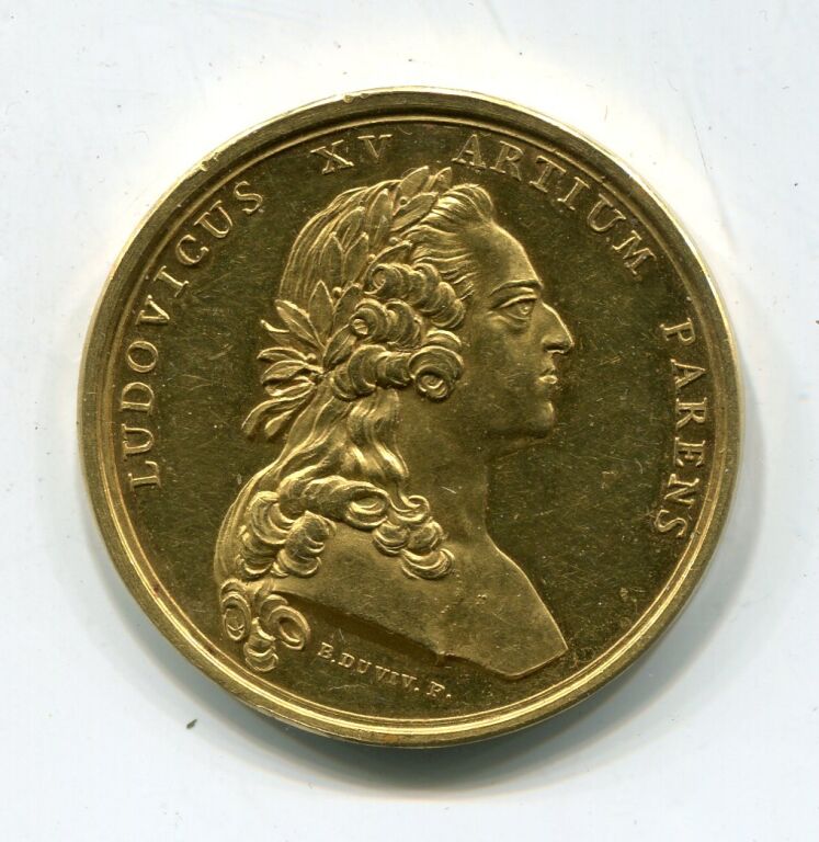 " LUDOVICUS XV ARTIUM PARENS " (louis 15 père des arts), buste du roi, tête laurée, longs cheveux noués par un ruban, profil à droite - œuvre signée B. DUVIV.