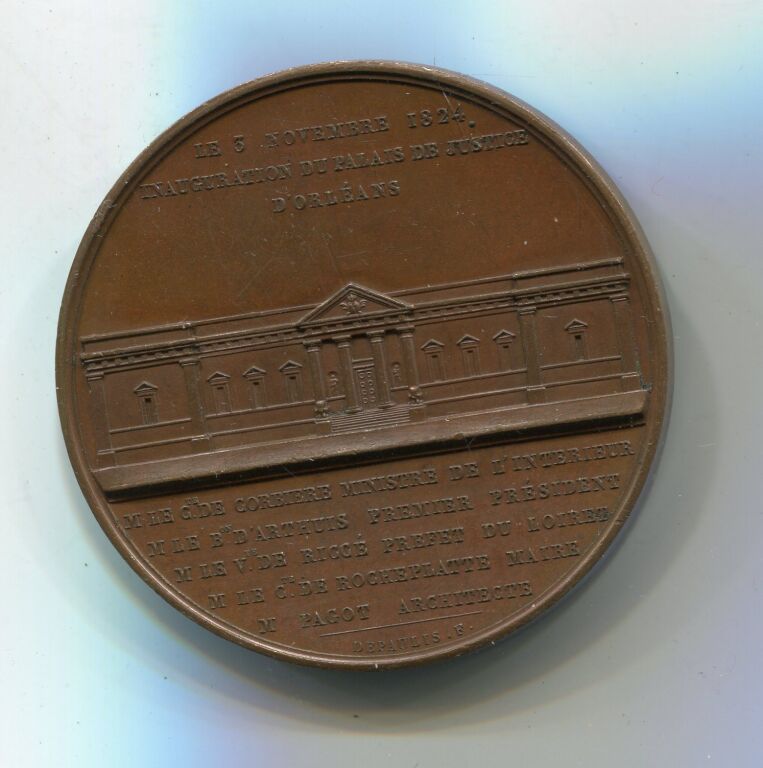 Revers : en centre, vue de face, façade du Palais de Justice et texte 8 lignes au-dessus et dessous : "le 5 novembre 1824, inauguration .../ M. le Cte de Corbière ministre de l'intérieur / M. le Bon D'Arthuis premier président / M. le Vte de Ricce préfet du Loiret / M. le Cte de Rocheplatte Maire / M PAGOT ARCHITECTE" ; revers signé Depaulis.