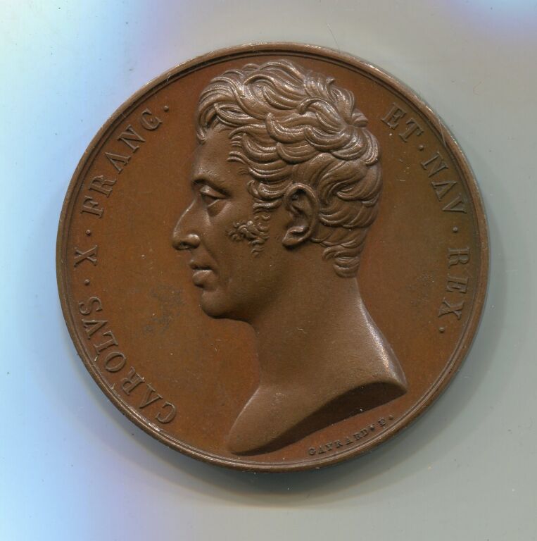 ORLEANS 1824 - INAUGURATION du PALAIS de JUSTICE - grande médaille commémorative en cuivre 51 mm - CAROLVS X FRANC ET NAV REX ", buste haut relief tête nue, ( tête fine ) profil à gauche - signature GAYRAUD graveur, en bord de listel.