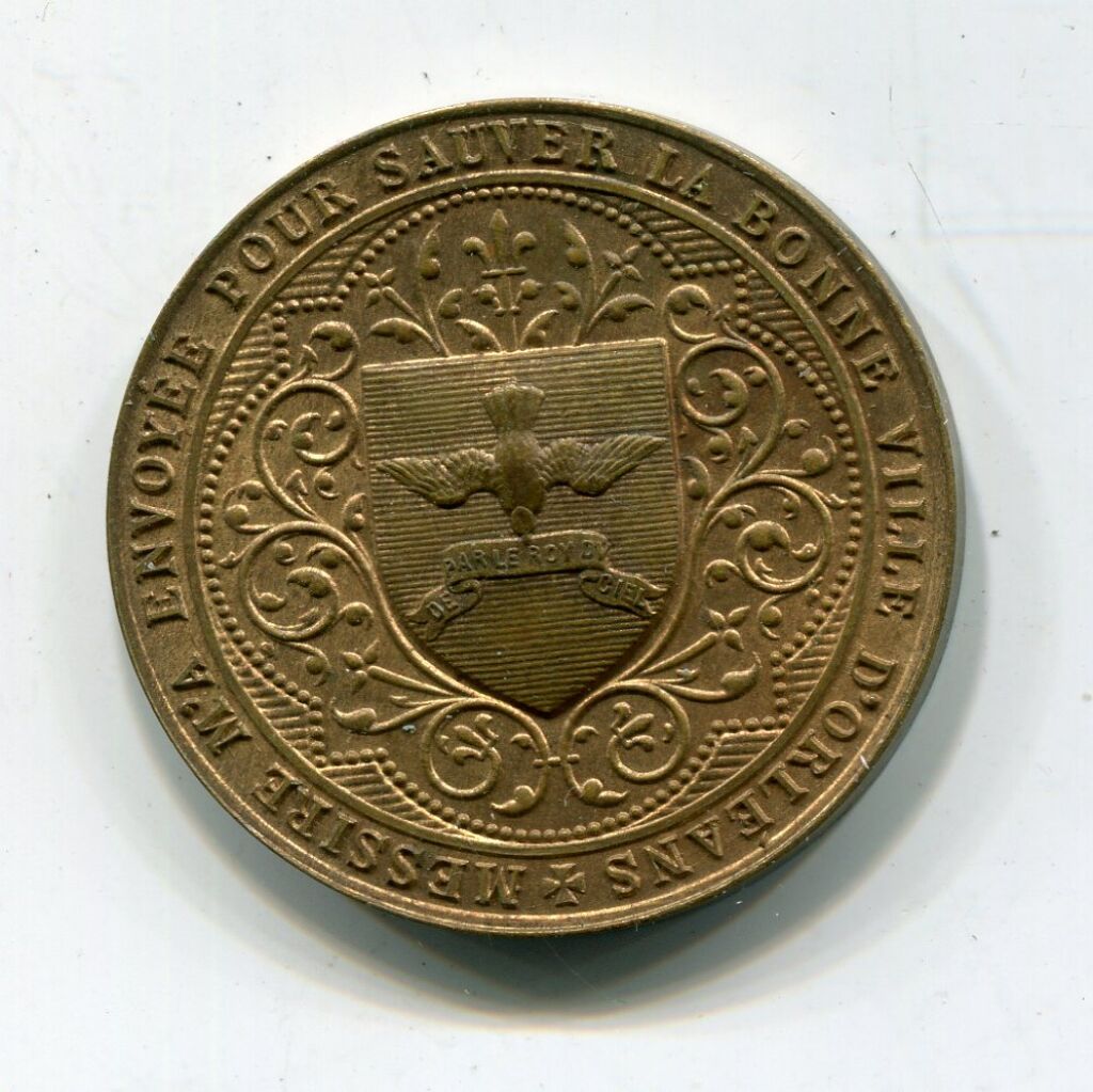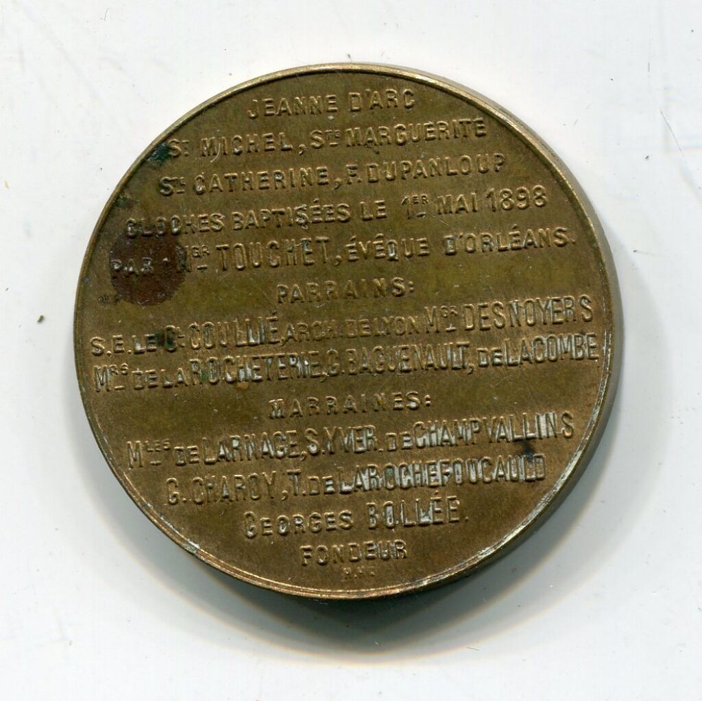 En centre, sur un quadrilobe de volutes, blason avec colombe tête en bas tenant une banderole "de par le roi du ciel" ; en légende circulaire : "Messire m'a envoyée pour sauver la bonne ville d'orléans" - Revers en 14 lignes : "JEANNE D'ARC / St MICHEL / SAINTE MARGUERITE / F. DUPANLOUP / cloches baptisées le 1er mai 1898 par Mgr Touchet, évêque d'Orléans / Parrains : S.E. le Cl Coullie arche. de Lyon, Mgr Desnoyers / Mrs de La Rocheterie, G. Baguenault, de Lacombes / Marraines, Mles de Larnage, Syver de Champvallins; G. Charoy, T. de la Rochefoucauld / Georges Bollee Fondeur.