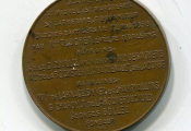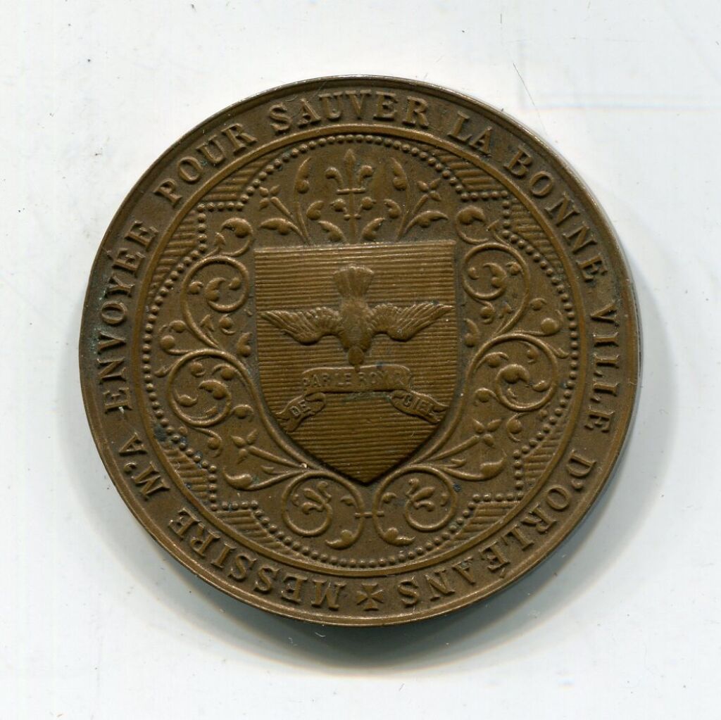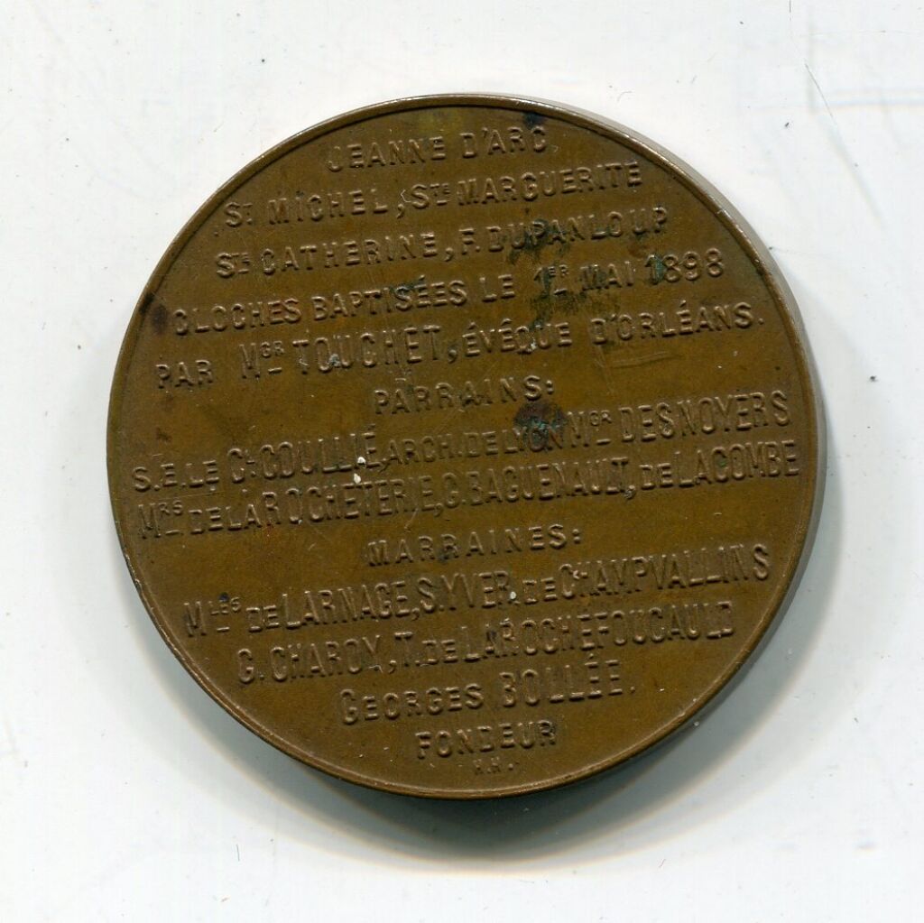 En centre, sur un quadrilobe de volutes, blason avec colombe tête en bas tenant une banderole "de par le roi du ciel" ; en légende circulaire : "Messire m'a envoyée pour sauver la bonne ville d'orléans" - Revers en 14 lignes : "JEANNE D'ARC / St MICHEL / SAINTE MARGUERITE / F. DUPANLOUP / cloches baptisées le 1er mai 1898 par Mgr Touchet, évêque d'Orléans / Parrains : S.E. le Cl Coullie arche. de Lyon, Mgr Desnoyers / Mrs de La Rocheterie, G. Baguenault, de Lacombes / Marraines, Mles de Larnage, Syver de Champvallins; G. Charoy, T. de la Rochefoucauld / Georges Bollee Fondeur.