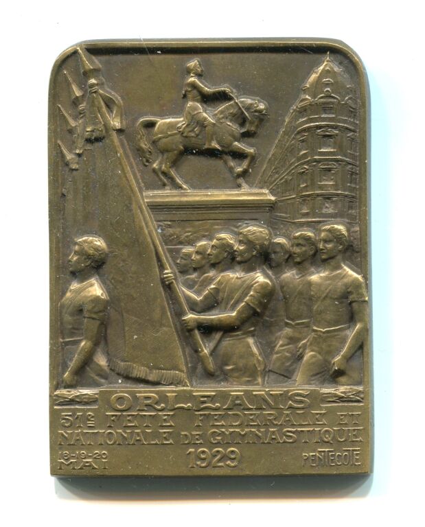 ORLEANS - " 51e FETE FEDERALE et NATIONALE de GYMNASTIQUE Pentecôte 18-19-20 MAI 1929 " Médaille souvenir uniface, plaque 68 x 51 mm - Défilé des athlètes place du Martroi, drapeau en tête et statue de JEANNE D'ARC en centre.