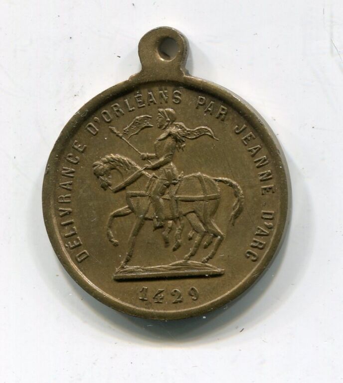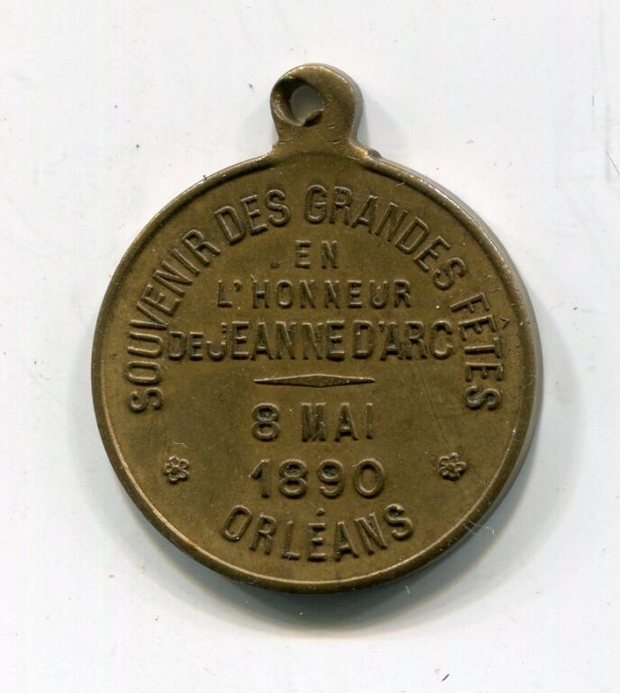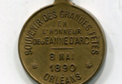 " ORLEANS 8 MAI 1890 - SOUVENIR des GRANDES FETES en L'HONNEUR de JEANNE D'ARC ", au droit Jeanne à cheval profil vers la gauche tenant étendard légende circulaire "délivrance d'orléans par jeanne d'arc 1429 " - Texte au revers.
