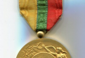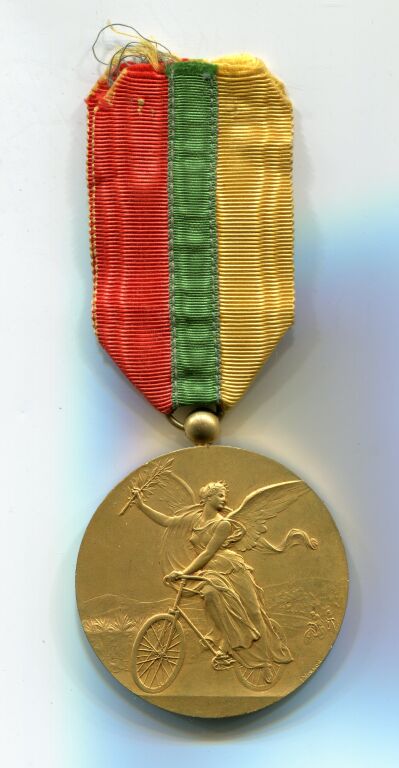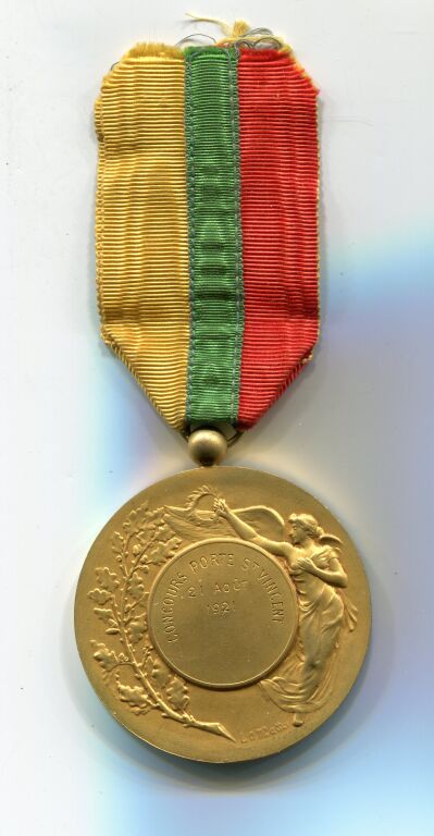 " ORLEANS / FETE du QUARTIER St VINCENT / 21 AOUT 1921 - Grande médaille du vainqueur de la coupe vélocipédique, médaille pendante avec large ruban 37 mm tricolore, rouge, vert, jaune - Femme ailée, vêtue à l'antique, en amazone sur une bicyclette, bras droit tendu tenant un rameau d'olivier - Revers : attribution en centre, rameau de feuilles de chêne et allégorie ailée tenant une couronne - Compositions du sculpteur Mattéi