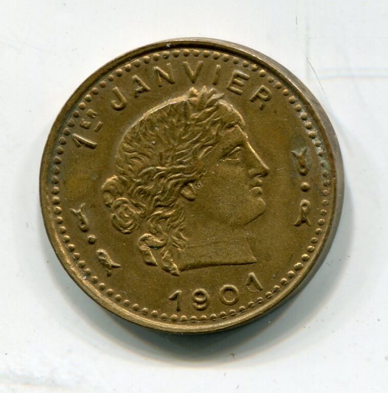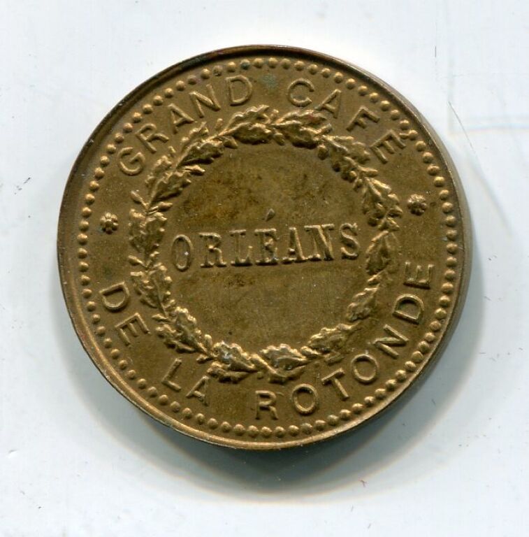 ORLEANS - " GRAND CAFE de la ROTONDE - 1 janvier 1901 " - JETON PUBLICITAIRE laiton fourré à la forme et la taille de la vingt francs OR (21 mm). Tête de Cérès profil à droite, texte au revers.