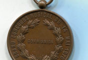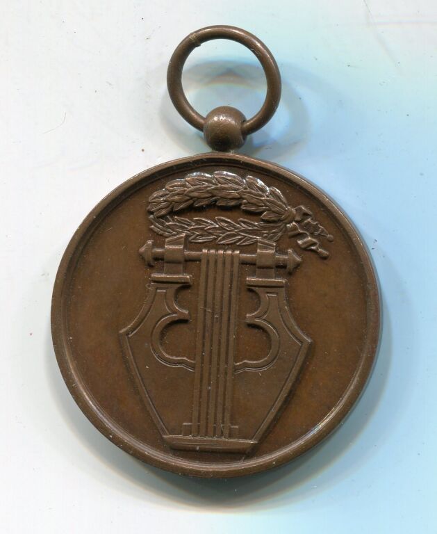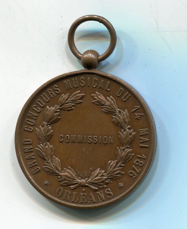 ORLEANS / GRAND CONCOURS MUSICAL du 14 MAI 1876 - médaille d'honneur en cuivre "COMMISSION" - Lyre à 5 cordes surmontée de 2 rameaux d'olivier couchés - texte au revers - 36 mm avec bélière -- L/A n° 1178 - TTB