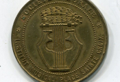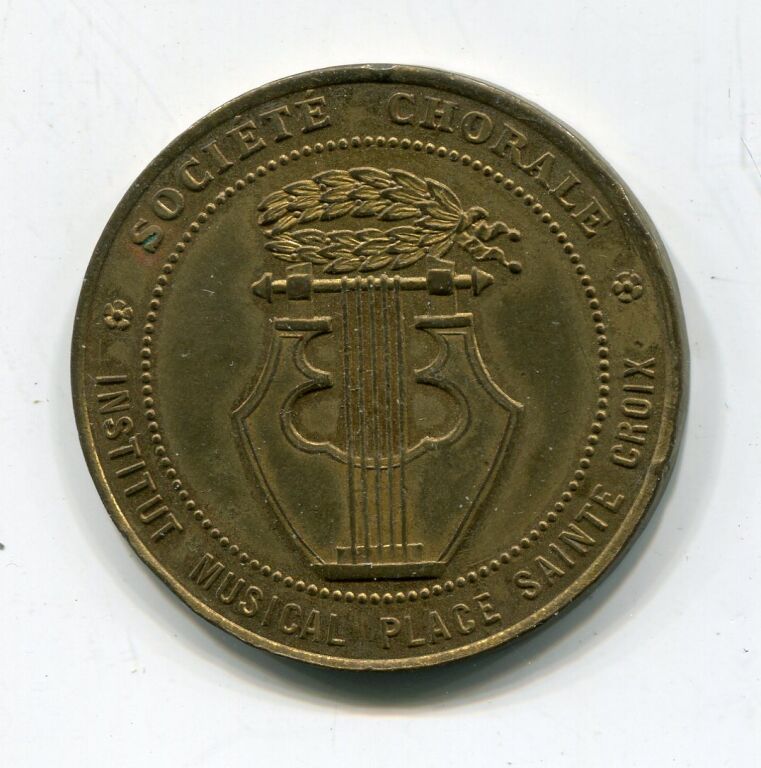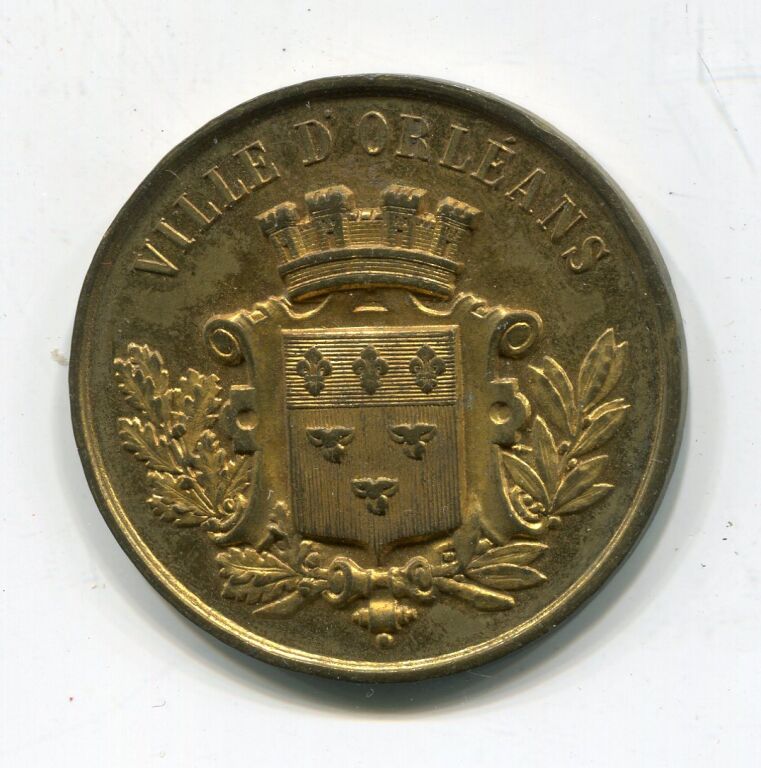 ORLEANS " INSTITUT MUSICAL Place Ste Croix / SOCIETE CHORALE " Médaille laiton épaisseur 2 mm - 36,5 mm - blason de ville couronné entre 2 palmes - au revers, en centre, Lyre à 5 cordes surmontée de 2 rameaux d'olivier couchés. - L/A n° 795 - TTB