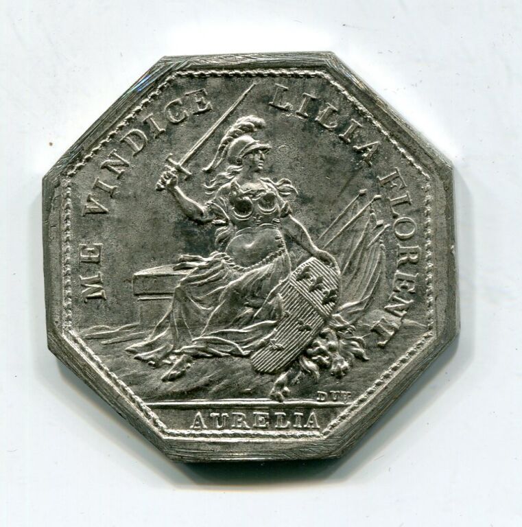 À l'avers ME VINDICE LILLA FLORENT, AURELIA à l'exergue - en centre La Pucelle assise de face, main droite tenant épée, main gauche sur le blason d'Orléans.