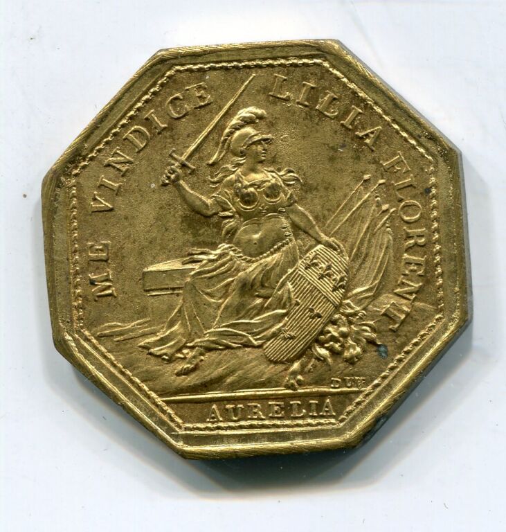 À l'avers ME VINDICE LILLA FLORENT, AURELIA à l'exergue - en centre La Pucelle assise de face, main droite tenant épée, main gauche sur le blason d'Orléans.