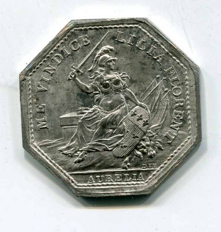 À l'avers ME VINDICE LILLA FLORENT, AURELIA à l'exergue - en centre La Pucelle assise de face, main droite tenant épée, main gauche sur le blason d'Orléans.