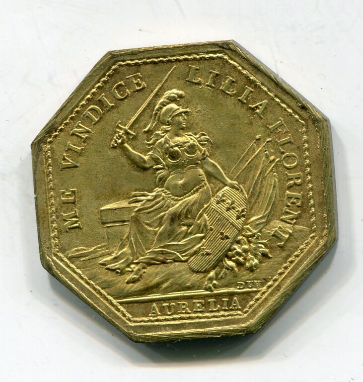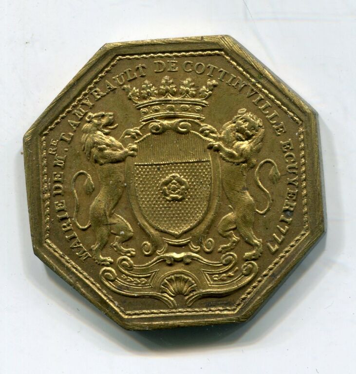 ORLEANS - JETON de MAIRE - refrappe 19e en BRONZE DORE " MAIRIE DE Mre LAMYRAULT DE COTTINVILLE ECUYER 1777 ses armes couronnées soutenues par 2 lions - Revers : ME VINDICE LILIA FLORENT en légende circulaire. AURELLIA à l'exergue - En centre la Pucelle assise de face, cordelette autour de la taille, tenant épée de la main droite, la gauche appuyée sur le blason d'Orléans, faisceau de drapeau à l'arrière - Signé DUV. à droite - tranche lisse sans poinçon. -