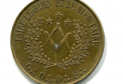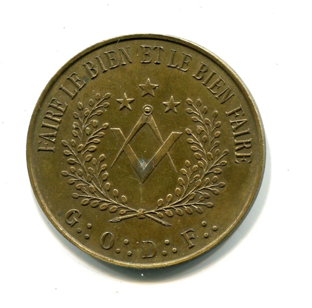 " FAIRE LE BIEN ET LE BIEN FAIRE ", équerre et compas entrecroisés sous 3 étoiles entourés d'une couronne d'acacia ; à l'exergue G (3 points) O (3 points) D (3 points) F (3 points) - au dos texte et place centrale pour attribution.