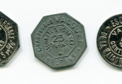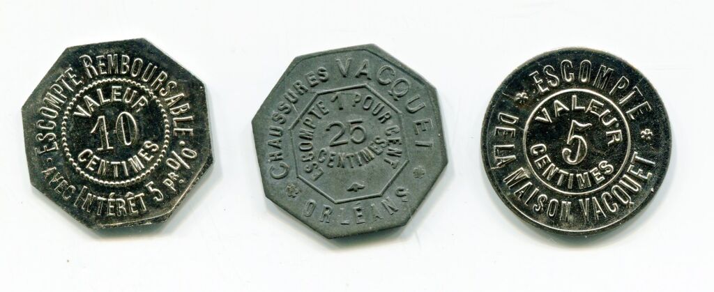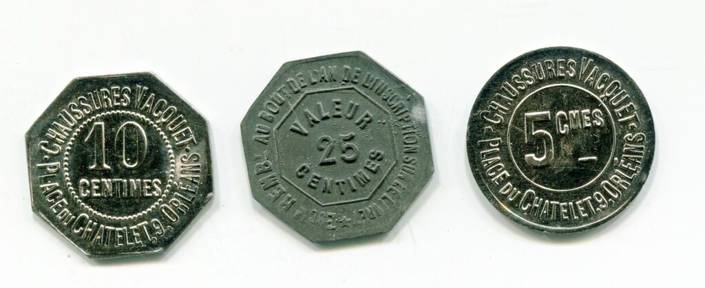 ORLEANS - MONNAIES de NECESSITE - 1914 / 1918 - CHAUSSURES VACQUET, Place du Chatelet - Collection des 3 monnaies émises : 5c rond zinc nickelé + 10c octogonale zinc nickelé + 25c zinc octogonale - Elie 30.1 à 30.3 - L/A n° 1702/04 - SUP