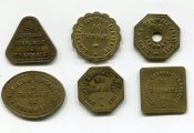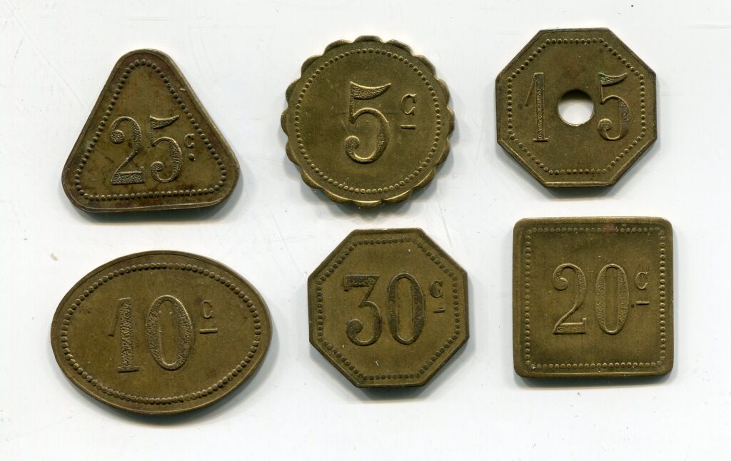 Laiton : 5c ronde festonnée + 10c ovale + 15c octogonale + 25c triangulaire + 30c octogonale + 20c carrée. - Elie n° 45.1 à 45.5 - L/A n° 2281 à 2286