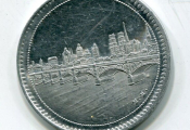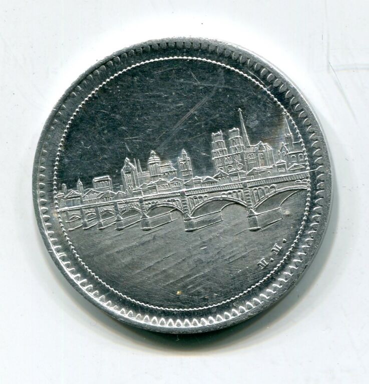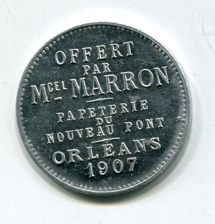 ORLEANS - " OFFERT par Mr MARRON - PAPETERIE du NOUVEAU PONT 1907 " - JETON PUBLICITAIRE aluminium 32 mm - Texte sur une face, au revers vue d'Orléans; Au premier plan la Loire et le Pont Neuf construit en 1905 (aujourd'hui pont Joffre).