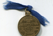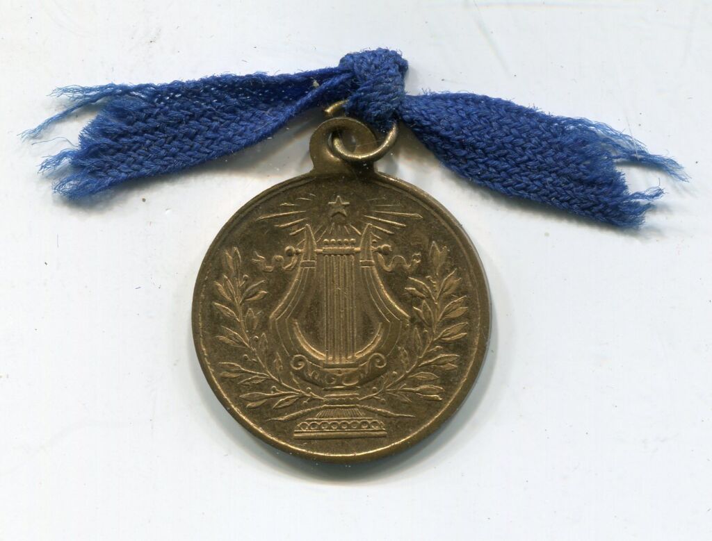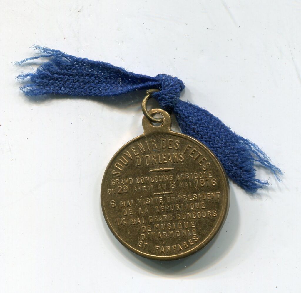ORLEANS - SOUVENIR des FETES de 1876 - médaillette pour port au veston. Laiton 23 mm avec petit ruban bleu d'origine - Couronne d'olivier entourant une Lyre à 5 cordes surmontée d'une étoile - Texte au revers, 8 lignes : " souvenir des fêtes d'orléans, grand concours agricole du 29 avril au 8 mai 1876 ; 6 mai visite du Président de la république ; 14 mai grand concours de musique d'harmonie et fanfares " - L/A n° 1052 - SUP