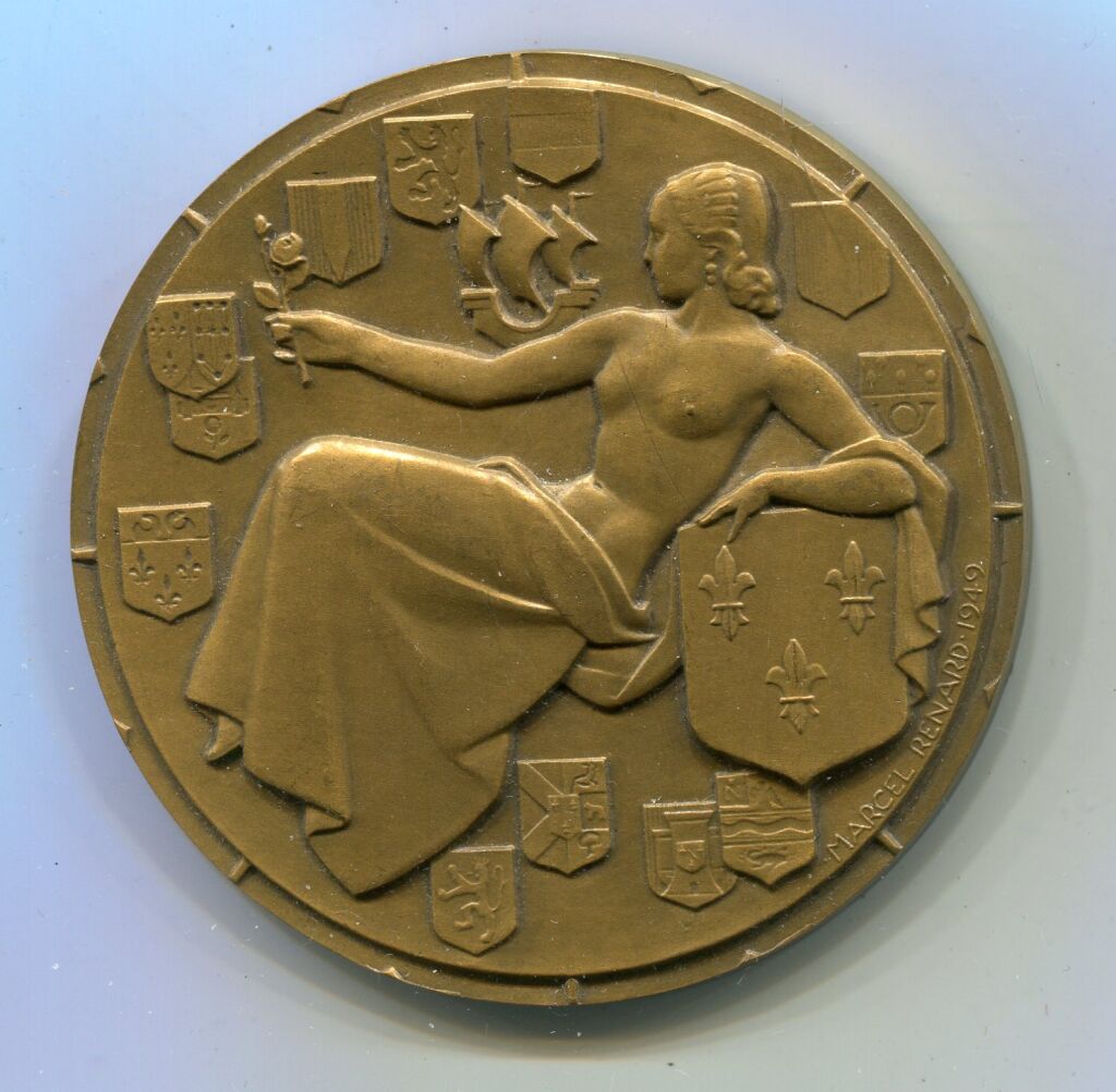 Revers : "C. G. T. French Line Ile de France ", carte maritime Le Havre New York, hublot avec mouettes en centre, au-dessus vue du navire à la mer par bâbord. OEuvre du sculpteur / médailleur Marcel RENARD 1949 - sur la tranche poinçons bronze et corne.