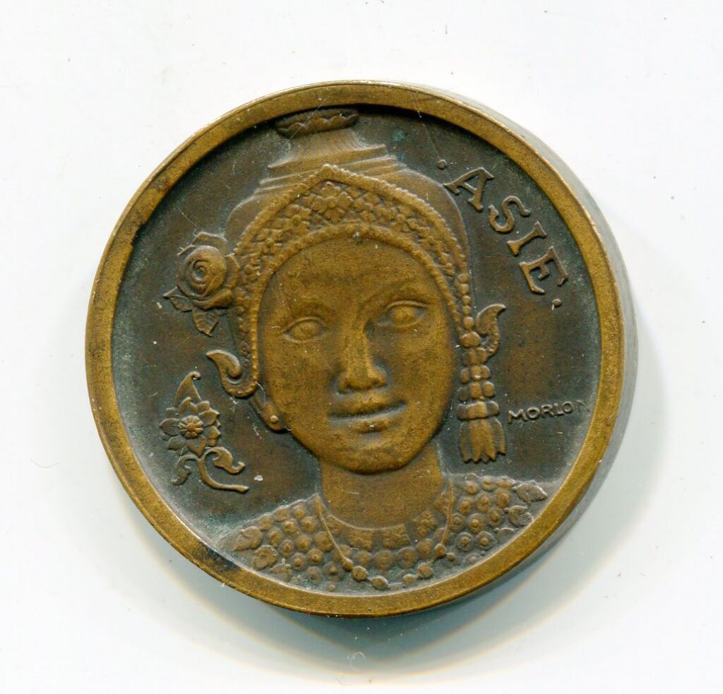 " PARIS / EXPOSITION COLONIALE INTERNATIONALE 1931 ", médaille en cuivre patiné bronze ELEPHANT de profil - Revers : ASIE, tête d'annamite en costume traditionnel, de face, œuvre signée MORLON - 32 mm - 18,87 grammes - TTB (petits chocs listel)