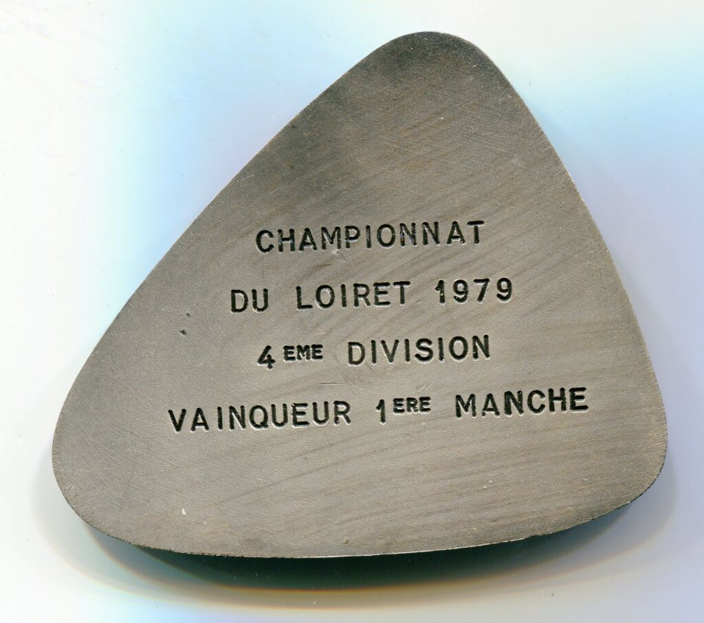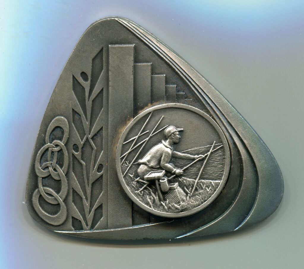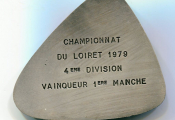 PECHE " CHAMPIONNAT du LOIRET 1979 " Médaille classe argent "4e division vainqueur 1ere manche - bronze argenté format ovoïde - petite médaille 27 mm pêcheur assis posée sur plaque 60 x 54 mm décorée de signes géométriques et anneaux olympiques.