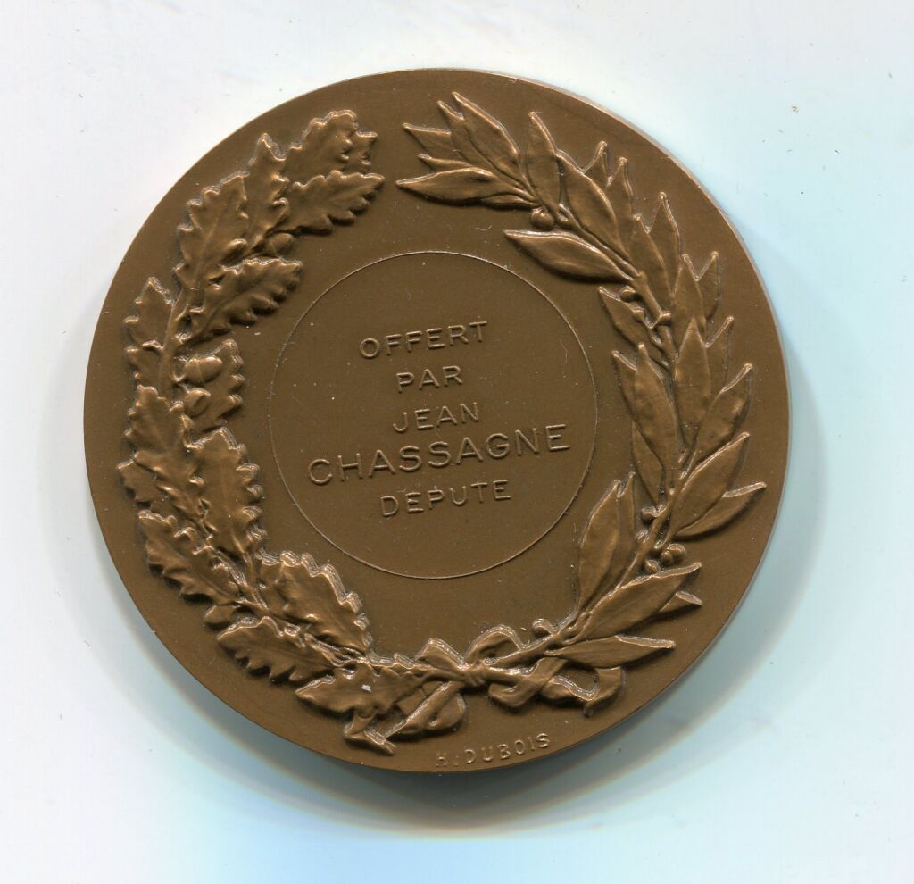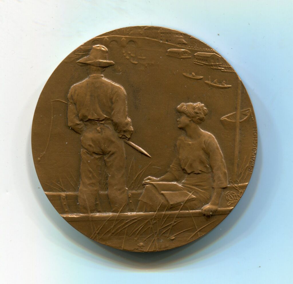 PECHE - médaille OFFERTE par JEAN CHASSAGNE / DEPUTE ( * ) - Belle gravure du sculpteur tourangeau Beaudichon paysage de pêche dans la Loire avec au 1er plan un couple dans une barque et, en arrière-plan, le pont royal et les quais d'Orléans. Texte au dos entre 2 palmes de feuilles de chêne et d'olivier. Frappe Monnaie de Paris, Bronze 50 mm poinçon corne - 64,17 grammes, datée 1967 - L/A n° 2432 var - TTB