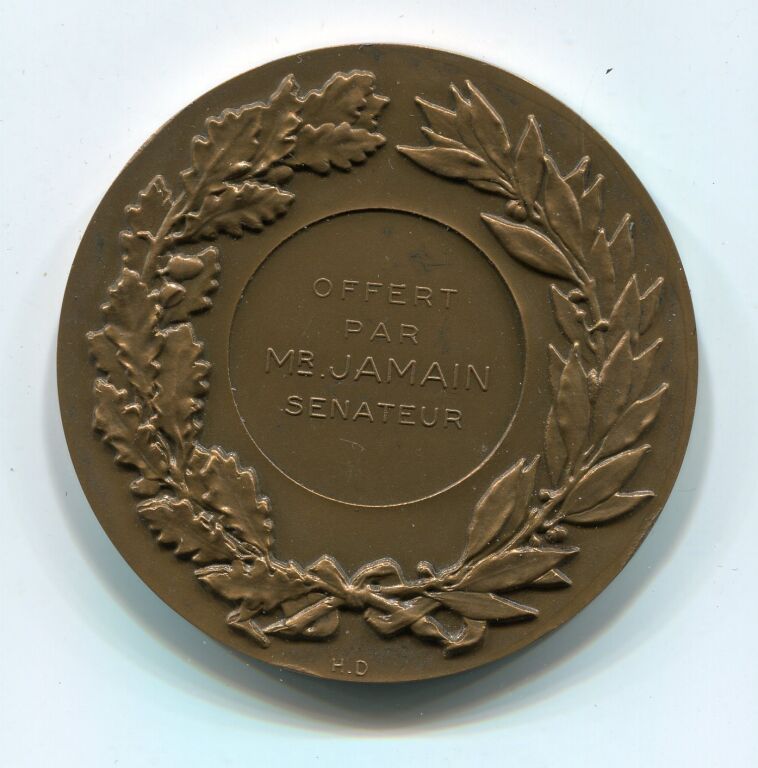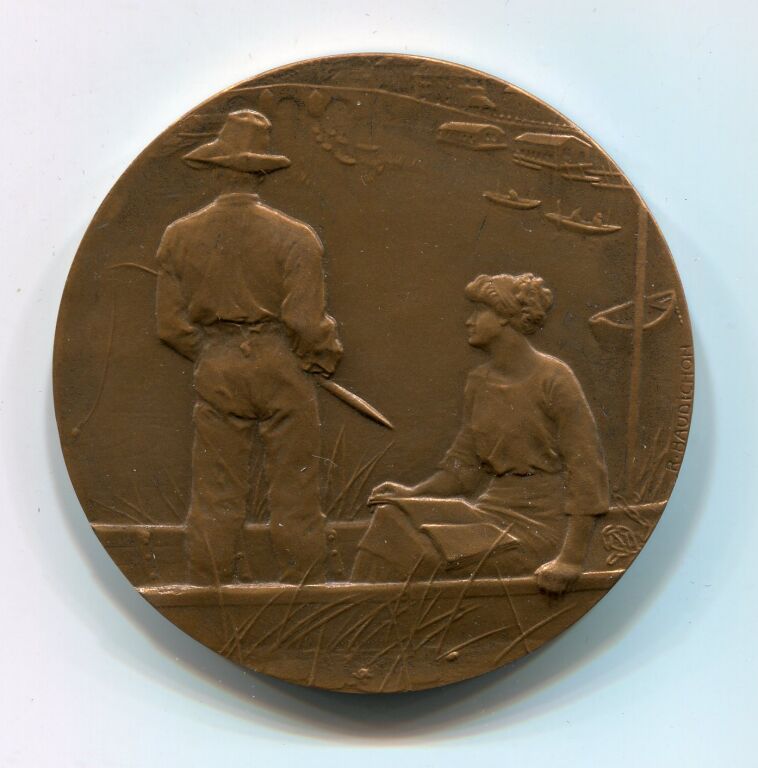 PECHE - médaille OFFERTE par Mr JAMAIN, SENATEUR ( * ) - Belle gravure du sculpteur tourangeau Beaudichon paysage de pêche dans la Loire avec au 1er plan un couple dans une barque et, en arrière-plan, le pont royal et les quais d'Orléans. Légende au dos entre 2 palmes de feuilles de chêne et d'olivier. Frappe Monnaie de Paris, Bronze 50 mm poinçon corne - 59,21 grammes. - L/A n° 2432 var - TTB