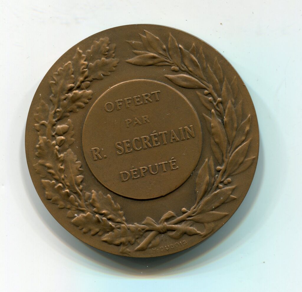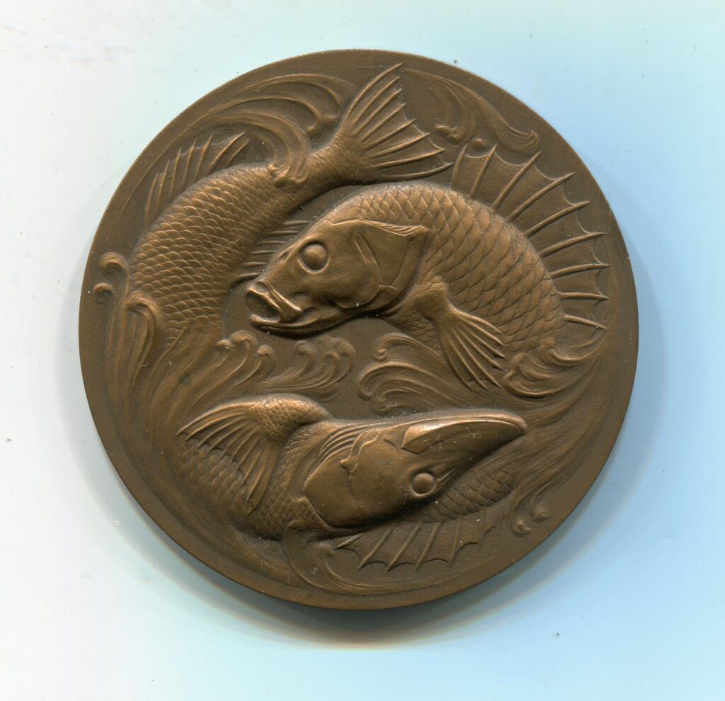 PECHE - médaille offerte par " R. SECRETAIN / DEPUTE ( * ) - Médaille de Dubois ( ** ) haut relief d'un brochet et d' un sandre nageant - au dos légende entre deux palmes de feuilles de chêne et d'olivier - Frappe monnaie de Paris, poinçon corne 50 mm.