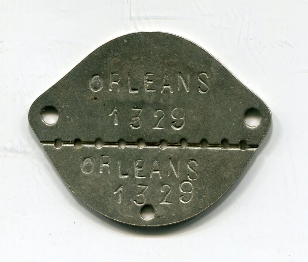 ( * ) - permet d'identifier au front lors de combats la personne qui la porte en cas de blessure ou décès - En deux parties séparées par des trous en ligne elle est sécable en deux ; ainsi une partie reste avec le soldat, l'autre permet a l'officier de garder trace.