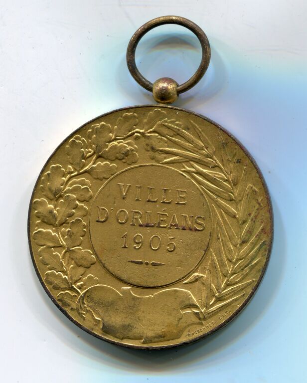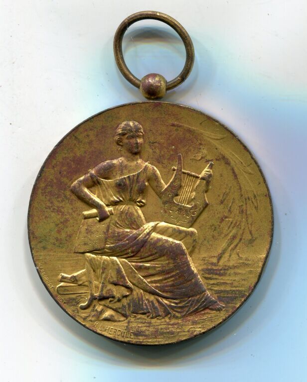 PRIX de MUSIQUE " VILLE D'ORLEANS 1905 " - Grande médaille avec bélière, cuivre doré, 50 mm - Sous une palme, jeune femme jouant de la Lyre, œuvre signée B.L. Hercule, Massonet éditeur - Texte au revers - 56,80 grammes - L/A n° 1397 - TB