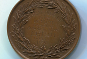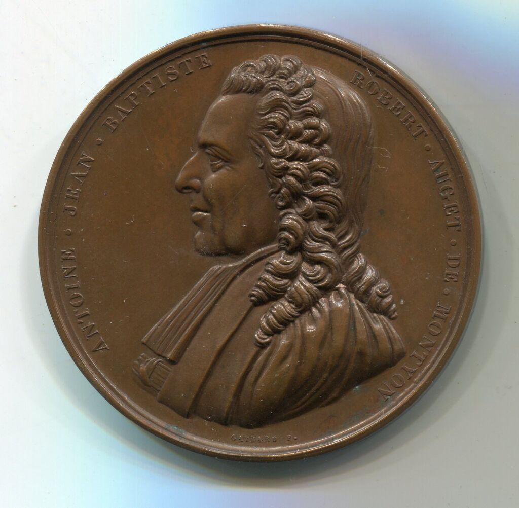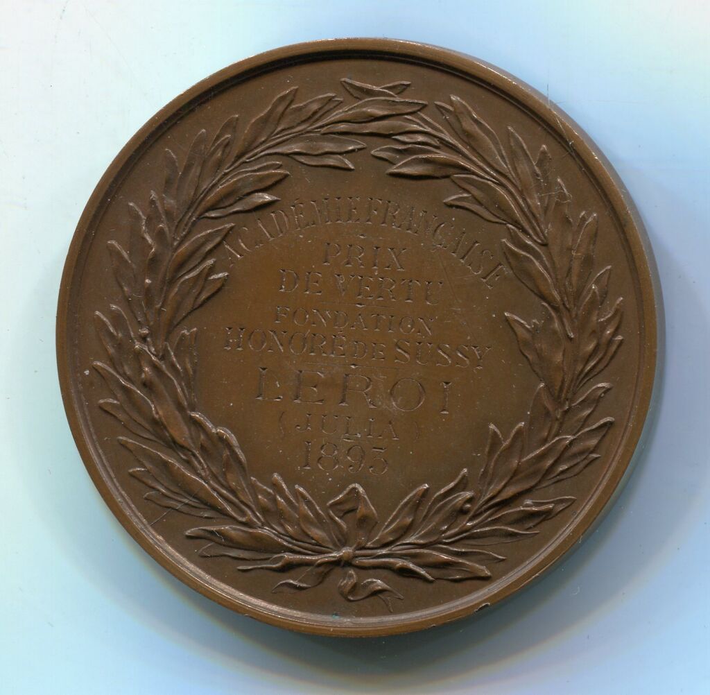 PRIX DE VERTU du BARON de MONTYON / ACADEMIE FRANCAISE. Médaille 51 mm cuivre rouge - "ANTOINE JEAN BAPTISTE ROBERT AUGET DE MONTYON " , son buste haut relief par gayrard- au revers, dans une couronne de feuilles de lauriers - 60 grammes. - Attribution : "Académie Française, PRIX de VERTU, Fondation Honoré de SUSSY à LEROI Julia 1893 " - sur la Tranche, mention cuivre et poinçon corne. -