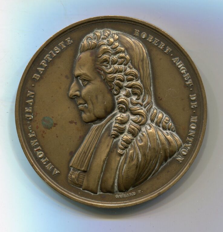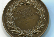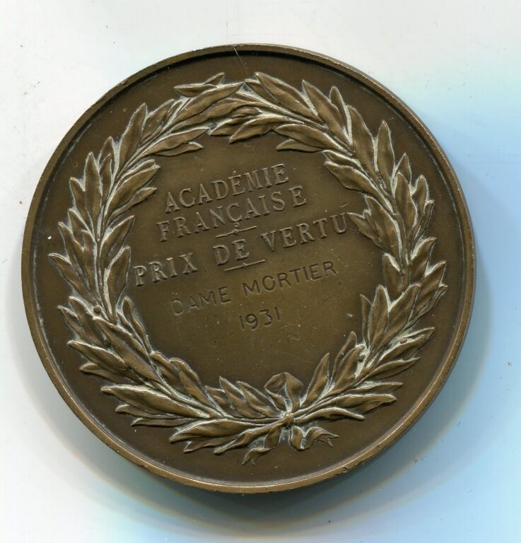 PRIX DE VERTU du BARON de MONTYON / ACADEMIE FRANCAISE. Médaille 51 mm cuivre rouge - "ANTOINE JEAN BAPTISTE ROBERT AUGET DE MONTYON " , son buste haut relief par gayrard- au revers, dans une couronne de feuilles de lauriers - 61 grammes. - Attribution : "Académie Française, PRIX de VERTU, " DAME MORTIER 1931- sur la Tranche, mention BRONZE et poinçon corne. -