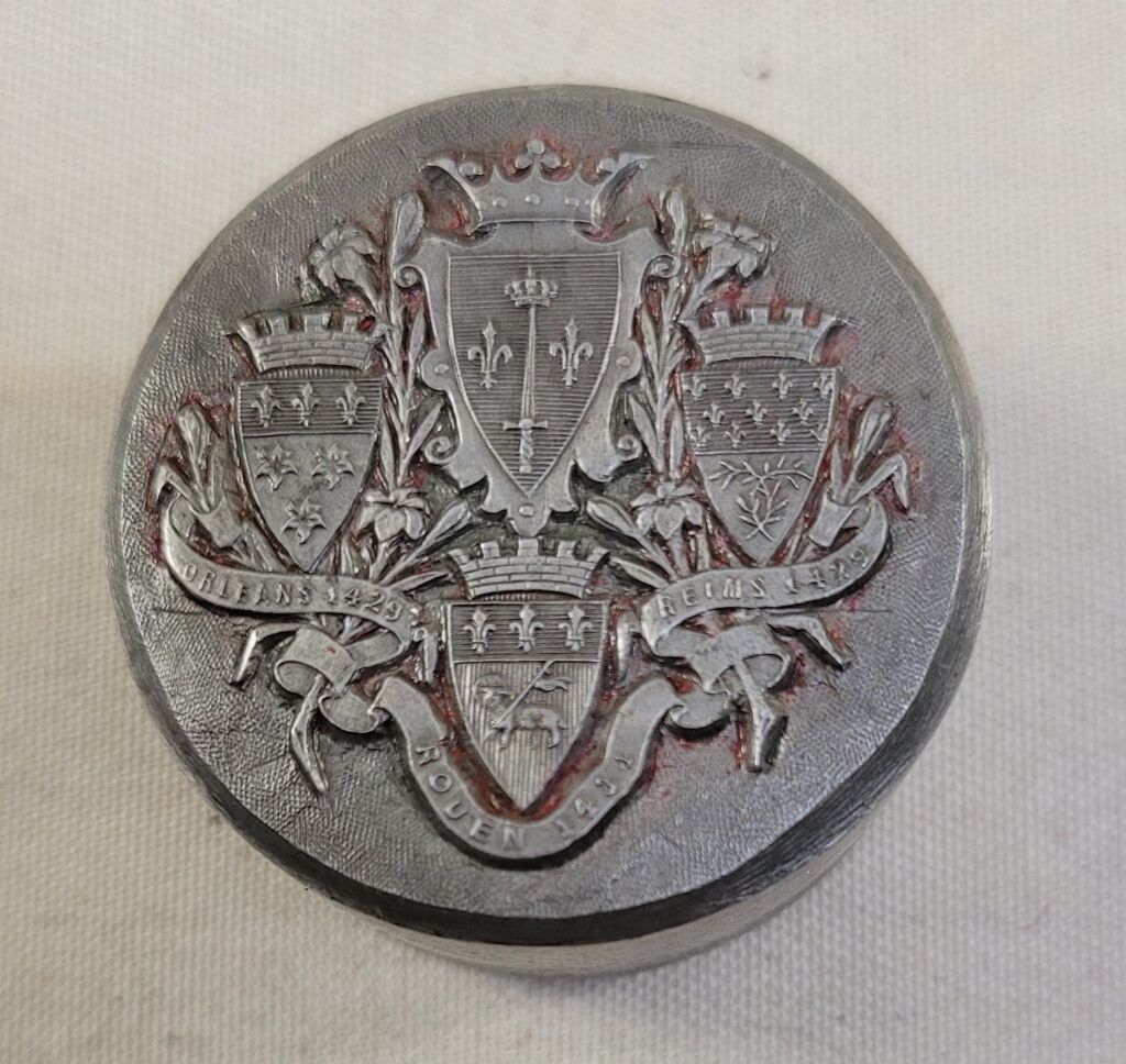 belle composition : armes de Jeanne surmontées d'une couronne nobiliaire, au milieu à gauche celles d'orléans surmontées d'une couronne ; sur une banderole "ORLEANS 1429", à droite celles de Rouen avec ROUEN 1431 dans une banderole en dessous, à gauche celles de REIMS 1429 - - COIN MONETAIRE : un bien joli et unique presse papier !