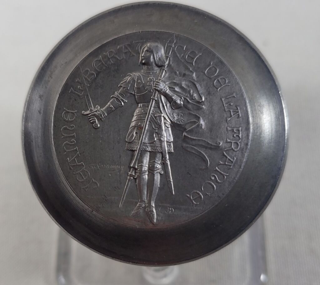 coin d' avers de la médaille : " JEANNE LIBERATRICE de la FRANCE ", Jeanne debout, cuirassée, de face, tenant épée de la main droite et son étendard flottant de la gauche.