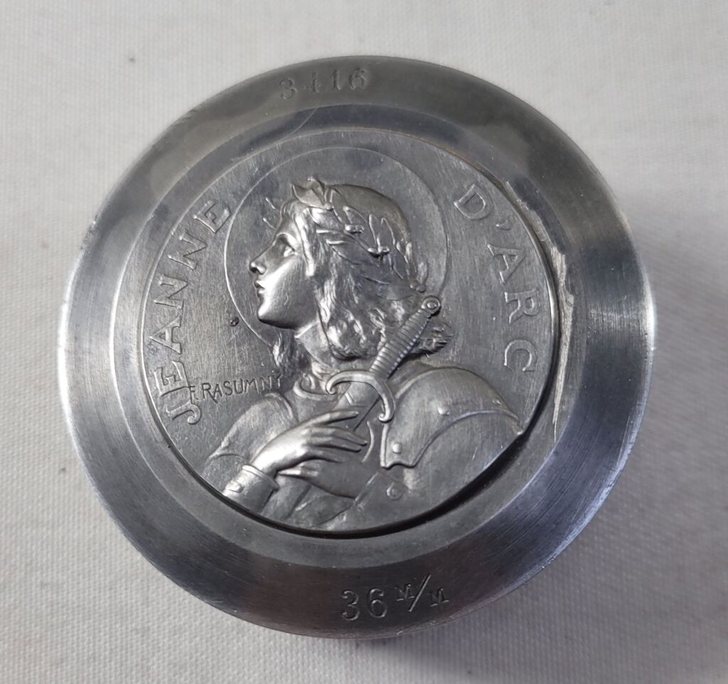 coin d' avers de la médaille : " JEANNE D'ARC " buste de Jeanne d'Arc de profil, couronne de laurier dans les cheveux, tête nimbée, profil à gauche. Porte armure et serre son épée, tenue à deux mains, contre elle. Signature RASUMNY en lettres majuscules dans le champ.